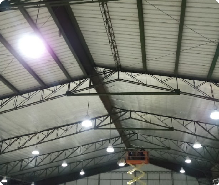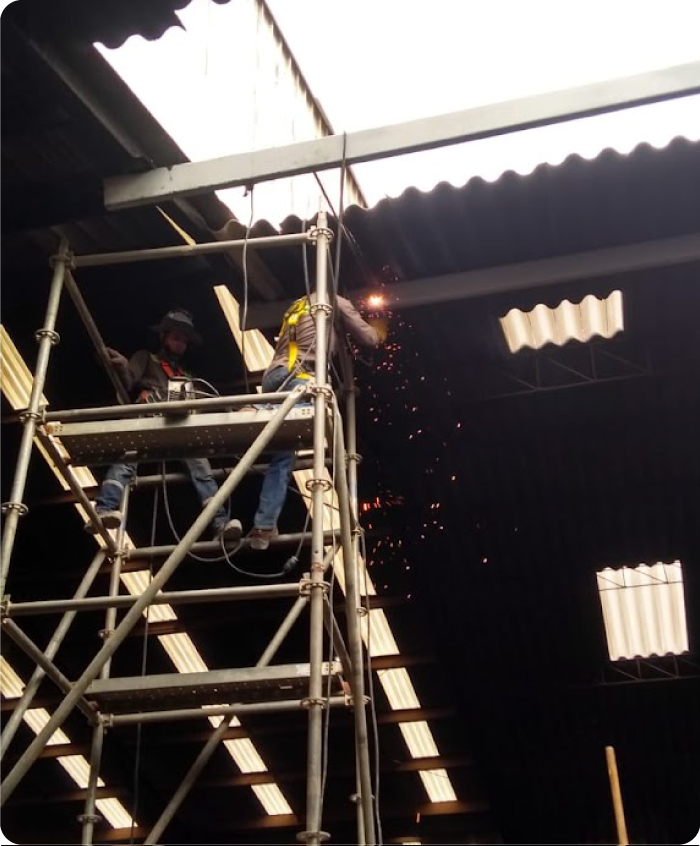 se instalan platinas entre cada cercha y posterior a ella se ensamblan ángulos enfrentados de 3” x ¼” bajo el sistema de soldadura de arco eléctrico. esto con el fin de conseguir un 20% extra de capacidad en la cubierta para el proyecto de paneles solares.