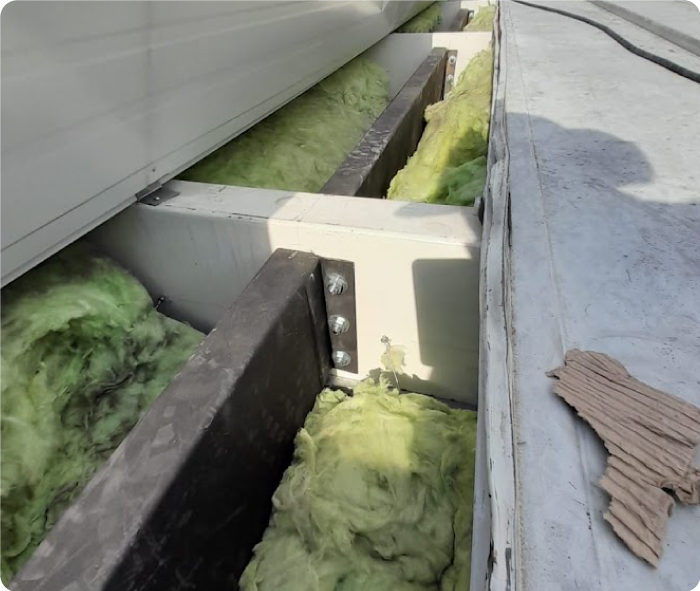 el sistema de pernos fijados a las correas fue una propuesta idónea ya que el uso de equipos de soldadura sobre esta cubierta ensanduchada no era adecuado, puesto que cuyo aislante termico era altamente incendiario.